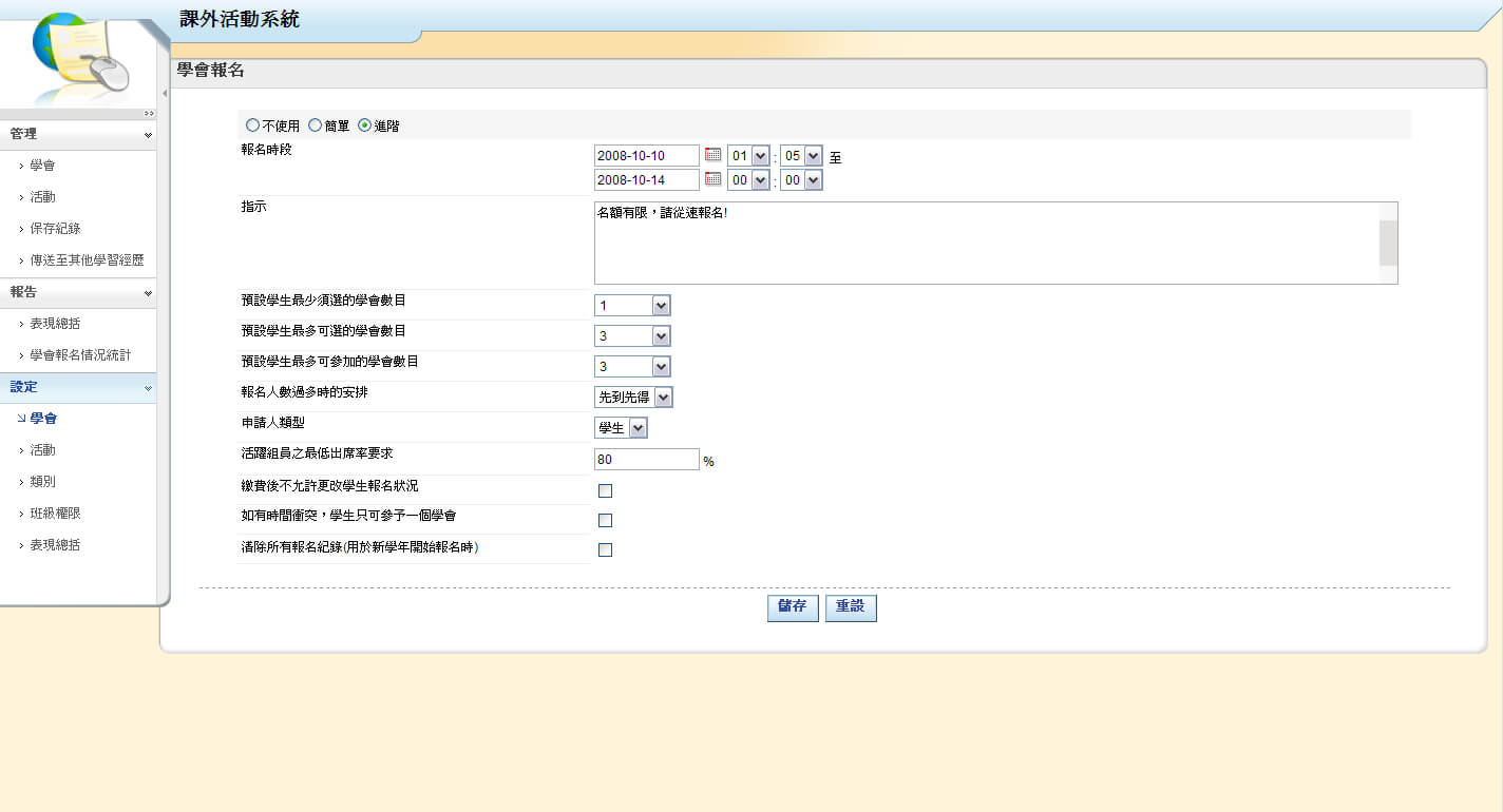 - 系統會根據設定進行報名程序,學校亦可自行設定個別學會或活動的參加名單